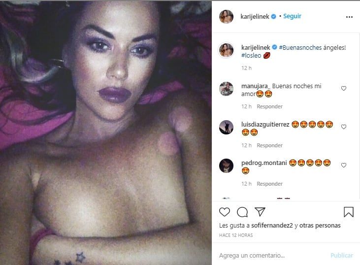 Al parecer, estar con el niño la dejó agotada y al momento de irse a dormir, decidió desearle las buenas noches a sus seguidores con una postal que subió la temperatura. En topless sobre su cama y con luz tenue de la intimidad de su cuarto, Jelinek saludó a sus fans.