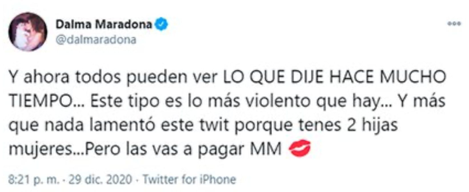 Dalma por su parte, fue fulminante respecto a Morla, a quien acusó desde el principio: “Y ahora todos pueden ver LO QUE DIJE HACE MUCHO TIEMPO... Este tipo es lo más violento que hay... Y más que nada lamento este twit porque tenés 2 hijas mujeres...Pero las vas a pagar MM”. Su mensaje termina con un beso, en donde la ironía sobra.