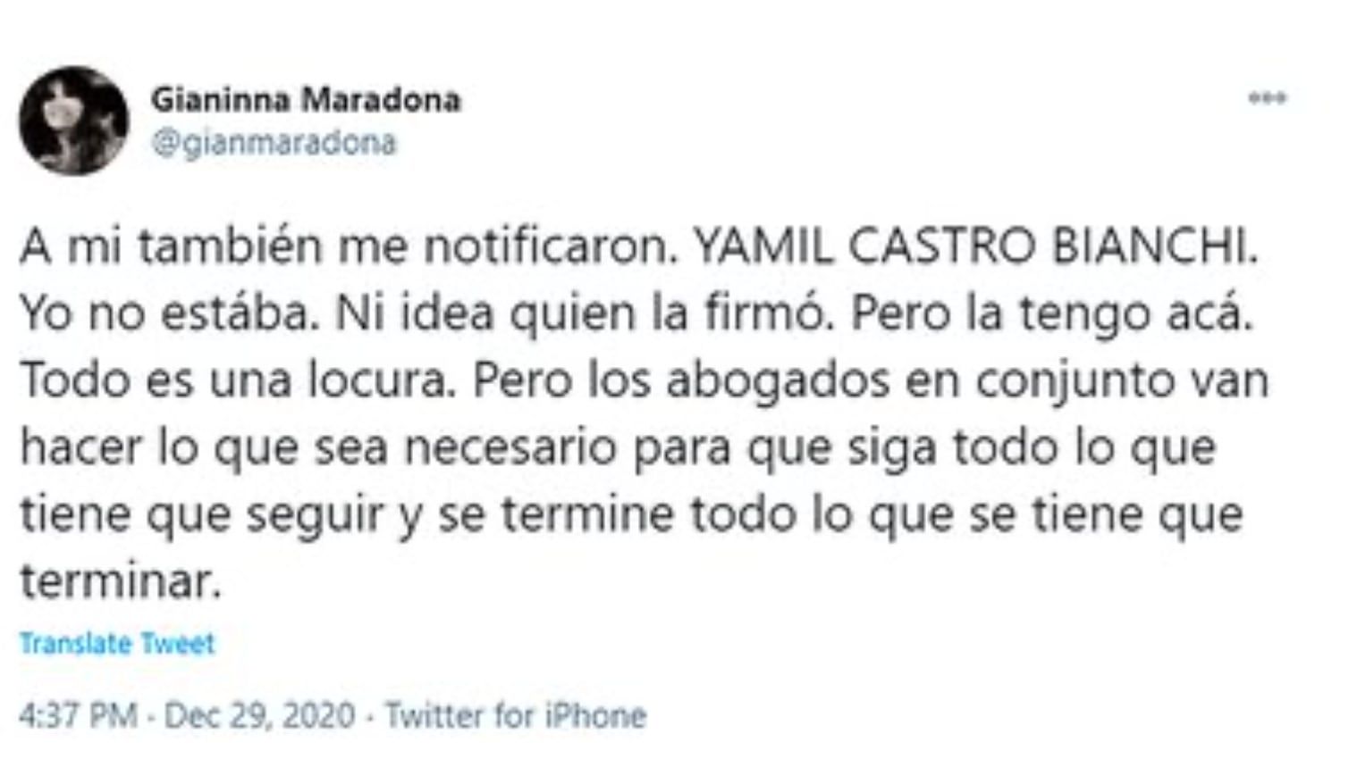 Sin dejarse estar, las dos primogénitas del astro del fútbol se encargaron de lanzar dardos por las redes sociales respecto a la situación que también les tocó vivir. Gianinna se refirió a la notificación que recibió, aunque justificó el trabajo de los abogados: “A mi también me notificaron. YAMIL CASTRO BIANCHI. Yo no estaba. Ni idea quien la firmó. Pero la tengo acá. Todo es una locura. Los abogados en conjunto van hacer lo que sea necesario para que siga todo lo que tiene que seguir y se termine todo lo que se tiene que terminar”. Sus palabras coinciden con las de Baudry, el apoderado de Dieguito Fernando.