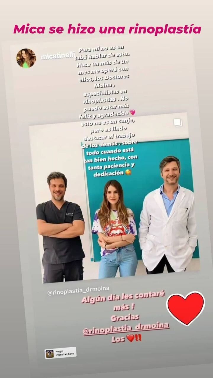 Como lo confirmó en sus redes, la joven se sometió a una rinoplastía con la que cambió la forma de su nariz. “Para mí no es un tabú hablar de esto. Hace más de un mes me operé con ellos, los doctores Moina, especialistas en rinoplastias”.