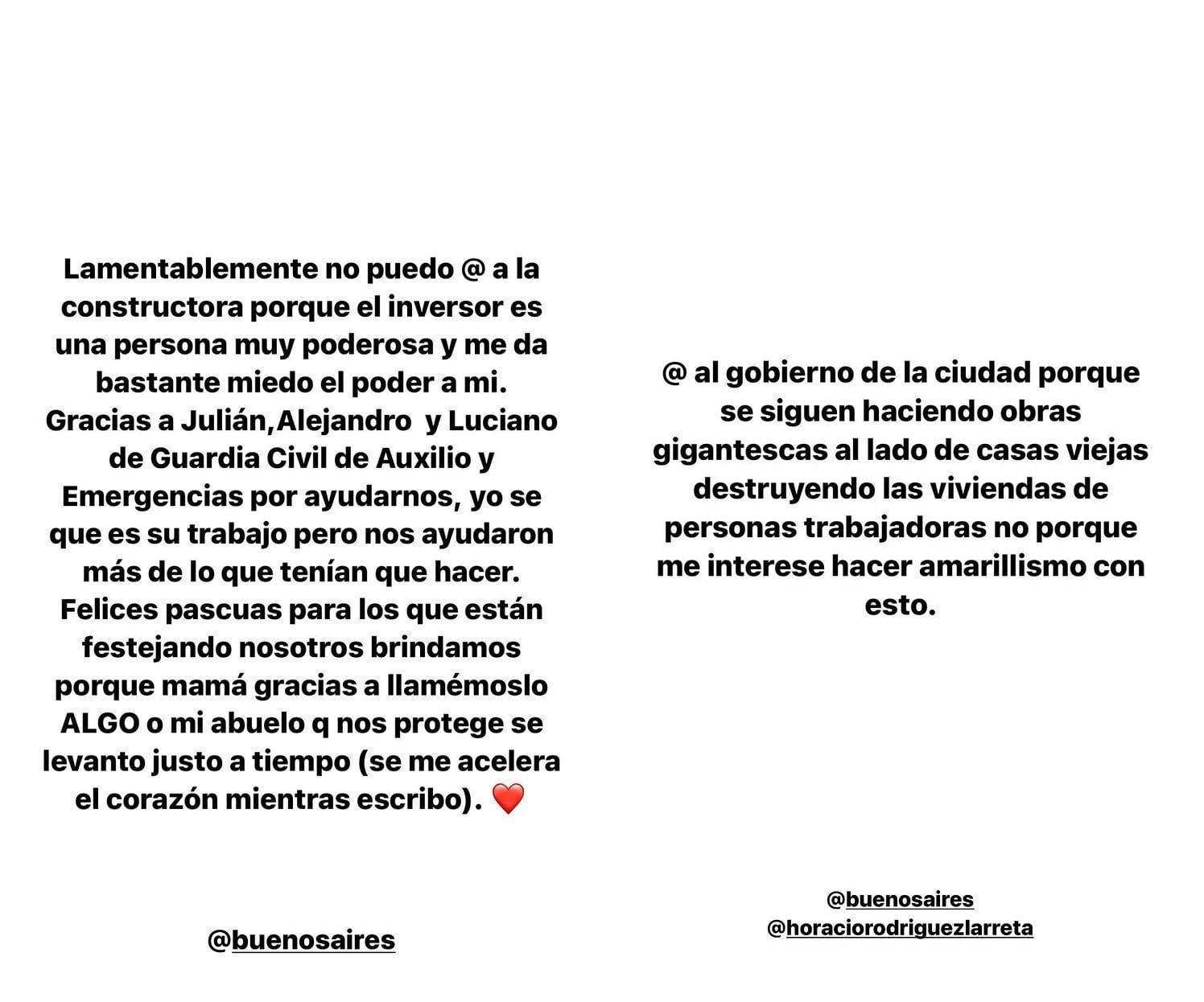 “Lamentablemente no puedo @ a la constructora porque el inversor es una persona muy poderosa y me da bastante miedo el poder a mí. Gracias a Julián, Alejandro y Luciano de Guardia Civil de Auxilio y Emergencias por ayudarnos”.
