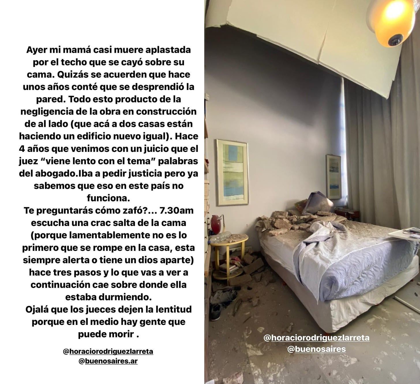 “Hace 4 años que venimos con un juicio que el juez ´viene lento el tema´ palabras del abogado. Iba a pedir justicia, pero ya sabemos que eso en este país no funciona”, suma en el relato virtual y agrega: “Te preguntarás cómo zafó... 7.30 am escucha un crac, salta de la cama (porque lamentablemente no es lo primero que se rompe en la casa, está siempre alerta o tiene un Dios aparte), hace tres pasos y lo que vas a ver ahora cae sobre donde ella estaba durmiendo. Ojalá que los jueces dejen la lentitud porque en el medio hay gente que puede morir”.