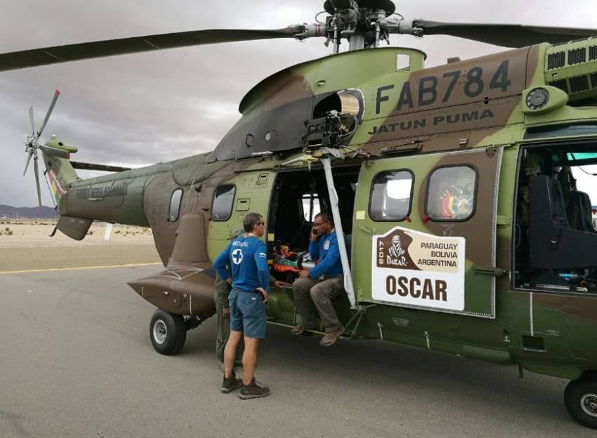 El piloto Jakes, que hace un par de días había sufrido la descarga de un rayo, tiene una fractura en la muñeca y fue llevado hasta Uyuni donde fue atendido en un hospital móvil; él al igual que el australiano Toby Price (ayer) recibieron el apoyo de efectivos militares especializados en rescate aéreo auxiliándolos a bordo de un Helicóptero JATUN PUMA de la FAB.