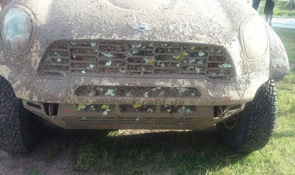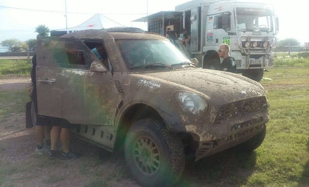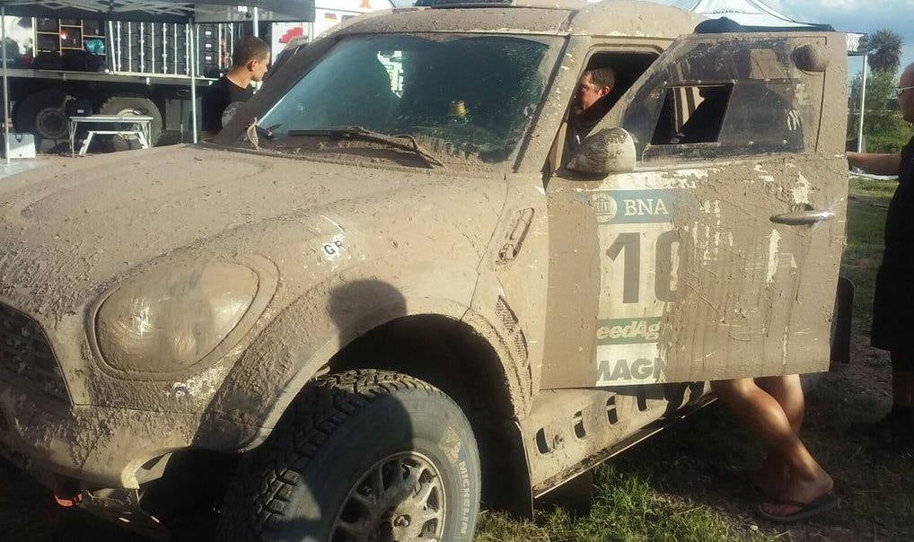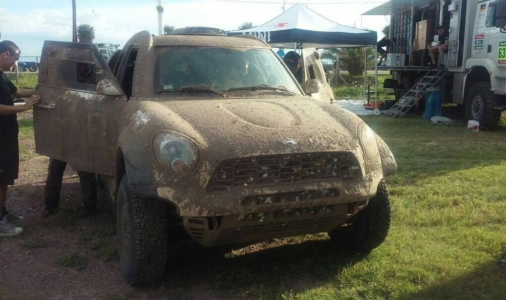 El Mini de Orly estaba prácticamente cubierto de lodo con excepción del parabrisas, el único y necesario lugar que pudo limpiar para lograr una visibilidad relativamente normal hasta completar la etapa.