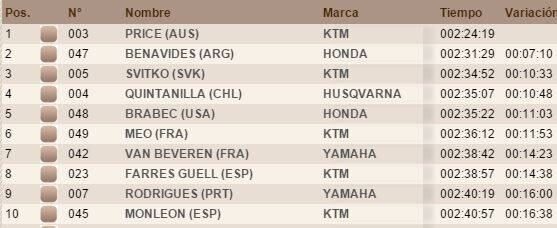 En tanto, la etapa fue ganada por el australiano Toby Price (KTM), quien utilizó un tiempo de 2h24m19s para recorrer los 179km cronometrados. Segundo fue Benavides (Honda), a 7m10s y tercero arribó Stefan Sviko, a 10m33s.