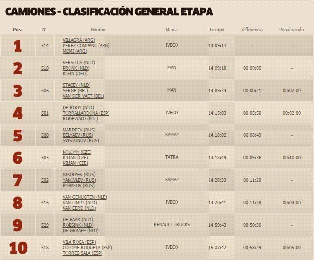 El argentino Federico Villagra arribó hoy tercero en la quinta etapa del Rally Dakar y quedó puntero en la clasificación general entre los camiones.