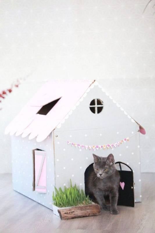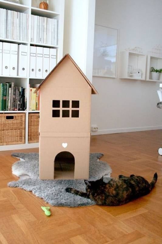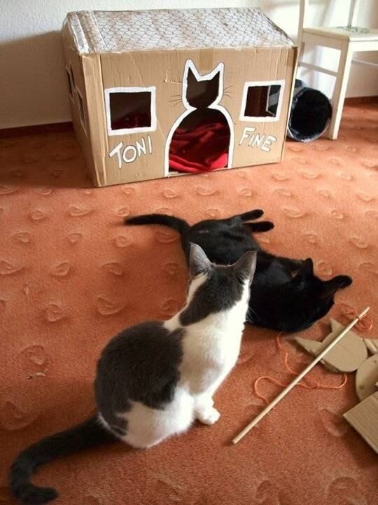 UNA CASA SENCILLA PERO ÚTIL. TIENE MUCHAS ABERTURAS PARA QUE ENTREN Y SALGAN, TAMBIÉN TIENE UNA PUERTA CON LA SILUETA DE UN GATO