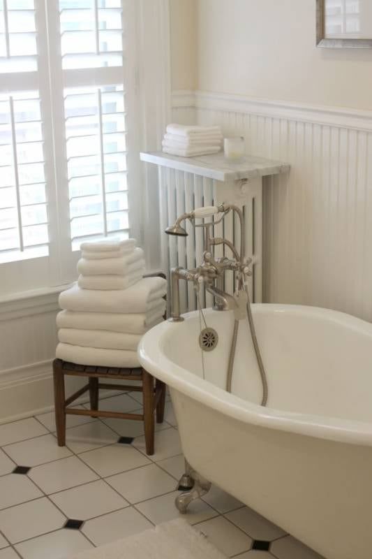 Aunque es una pieza decorativa de lujo, colocar una repisa de mármol encima del radiador del baño ofrece un resultado simple. En ella se pueden colocar toallas o productos de baño.