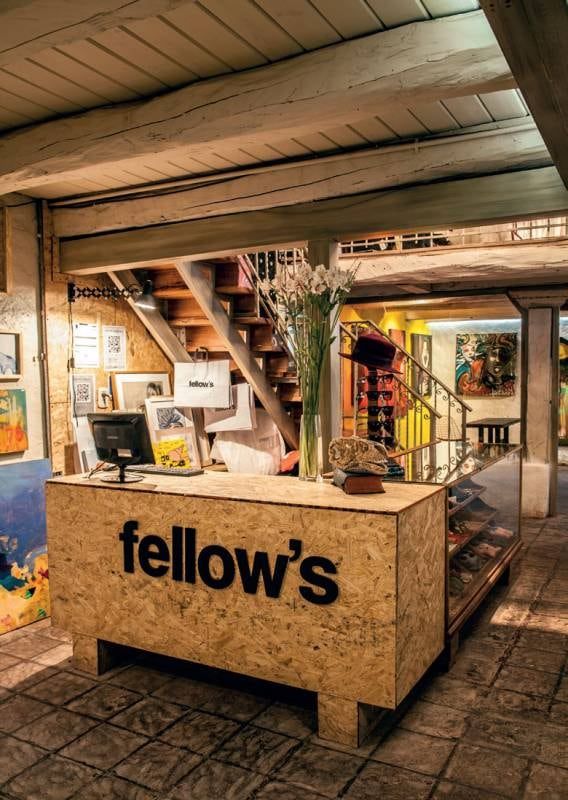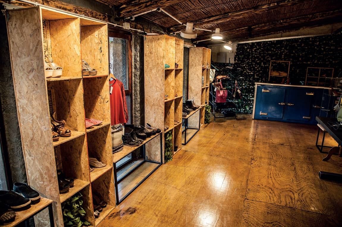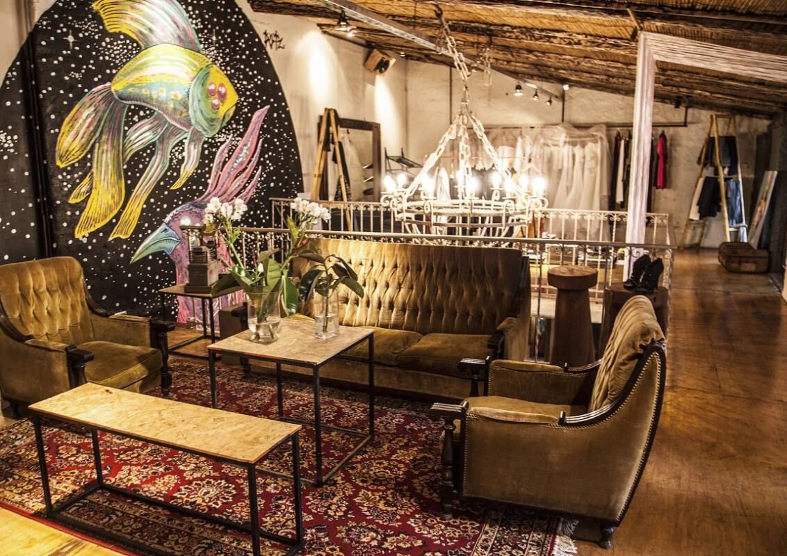 Al ingresar al local, un impactante mural rompe con el estilo clásico y con terminaciones rústicas propias del edificio. Un antiguo mueble exhibidor con cajones, hace de recepción y exposición de algunos objetos que se comercializan. La escalera de madera que lleva al segundo piso, tiene una baranda de hierro que posee el mismo trabajo que la araña central.