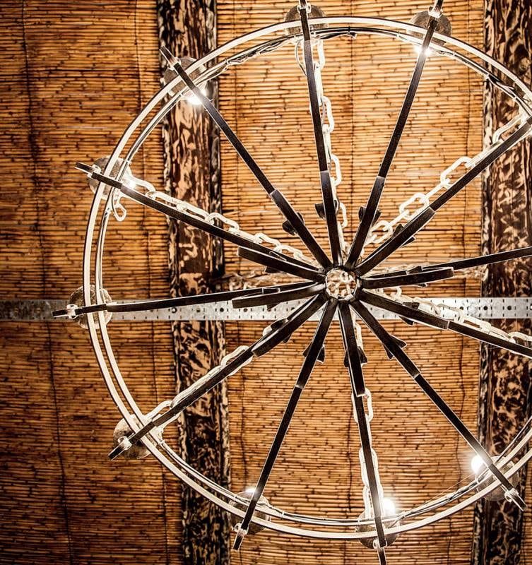 Detalle de la enorme araña de hierro blanca que ilumina gran parte del local. El techo, rústico de caña, con la cabreada patinada en tonos blancos.