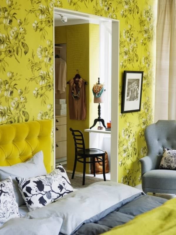 Para el dormitorio, el estilo clásico y romántico no está reñido con el amarillo, porque mediante un tono casi dorado de papel pintado y los textiles en concordancia, crearás una cama de ensueño. No obstante, si tenés un gusto más minimalista, bastará con que las tulipas de las lámparas sean de este tono, con el mobiliario en blanco impoluto, e introducir algún cuadro de otro color llamativo, como el rojo, en contraste.