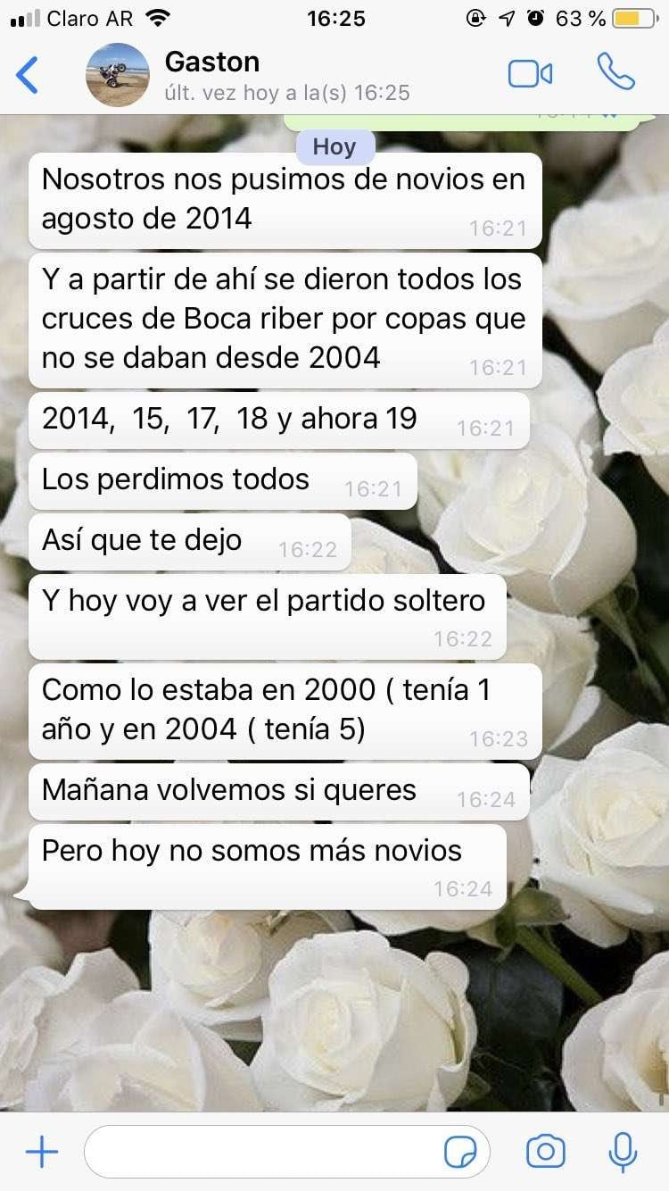 Ahí, fue a fondo: "Los perdimos todos. Así que te dejo, hoy voy a ver el partido soltero. Mañana volvemos si querés, pero hoy no somos más novios".