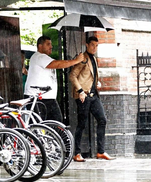 (CR7 acompañado por un guardaespaldas a la salida de un restaurante italiano en Londres.)