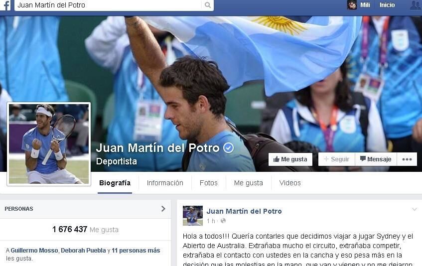 "Hola a todos!!! Quería contarles que decidimos viajar a jugar Sydney y el Abierto de Australia. Extrañaba mucho el circuito, extrañaba competir, extrañaba el contacto con ustedes en la cancha y eso pesa más en la decisión que las molestias en la mano, que van y vienen y no me dejaron tener la pretemporada ideal", expresó Del Potro.