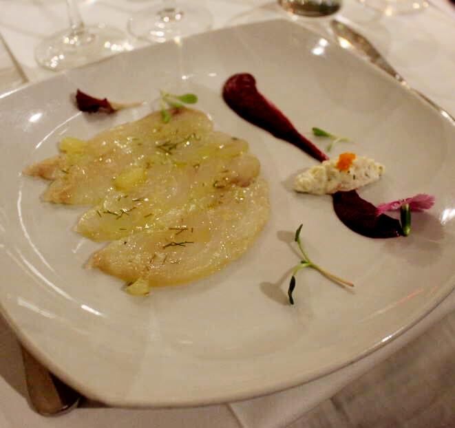 Entrada: "Gravlas de salmón, crema ácida de manzana, hinojo, apio, y coulis de remolacha"