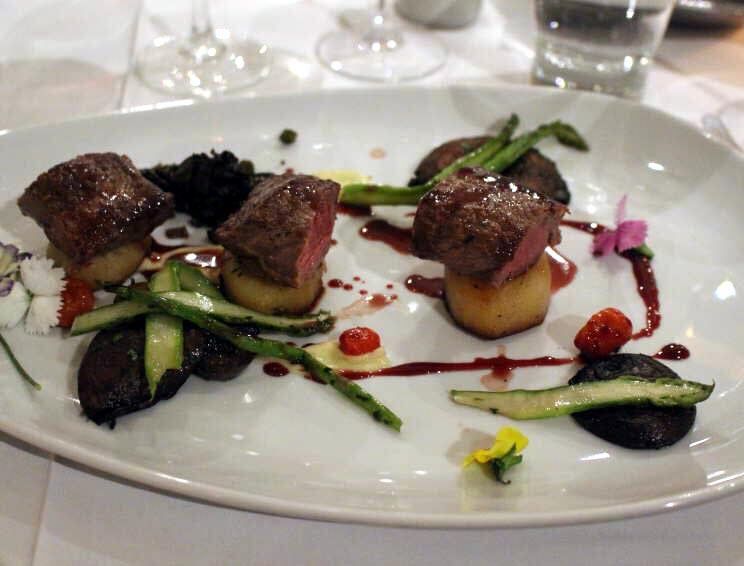 Principal: "Lomo de cordero con papas fondant, blanco de ajo, salteado de hongos cherrys, espárragos, gastric de naranja y malbec"