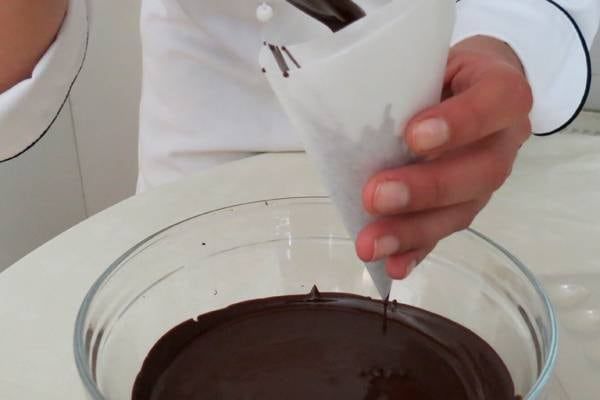 5. Para facilitar el trabajo llenar en bolsitas de polietileno con los rellenos y otra con chocolate derretido.