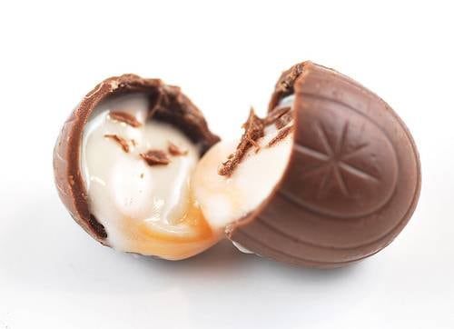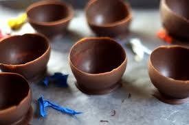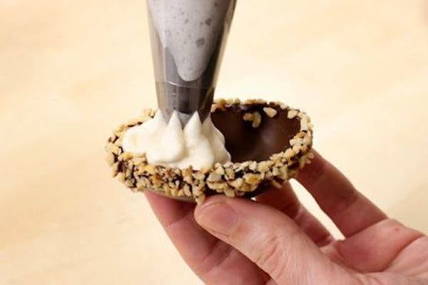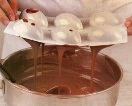6. Rellenar las dos partes del huevo con ganache. Alrededor de cada huevo poner chocolate derretido.