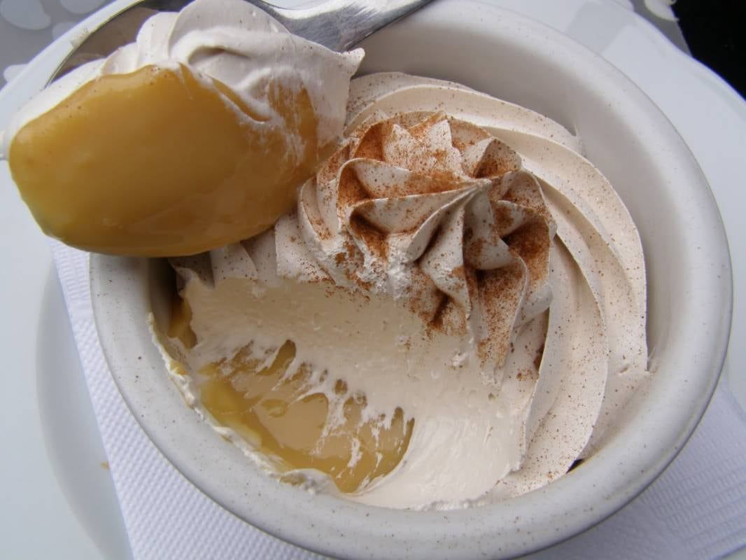 4. Para el merengue, mezclar el azúcar y el oporto en una olla pequeña y hervir hasta que el almíbar forme un hilo cuando se deja caer de una cuchara. Batir las claras de huevo hasta punto de nieve y suavemente agregar almíbar caliente (siempre batiendo). Colocar el merengue encima del manjar y espolvorear con canela molina.