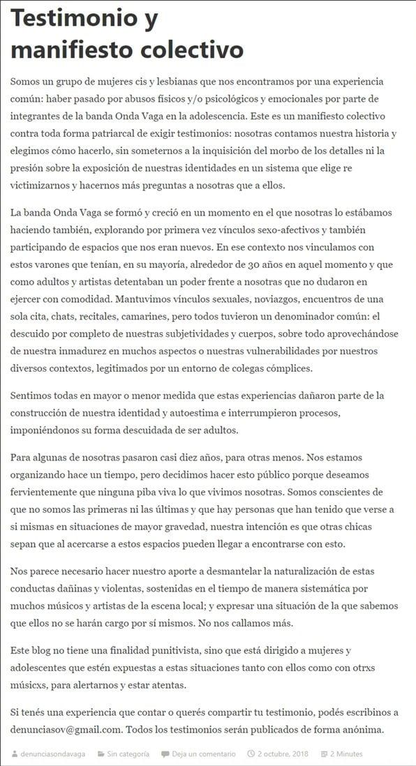 Internet es una de las herramientas más usada para hacer visibles muchos hechos oscuros. Así pensó un grupo de 10 mujeres que redactaron un "manifiesto colectivo" con el que busca reunir testimonios de víctimas de abusos de los músicos de Onda Vaga.