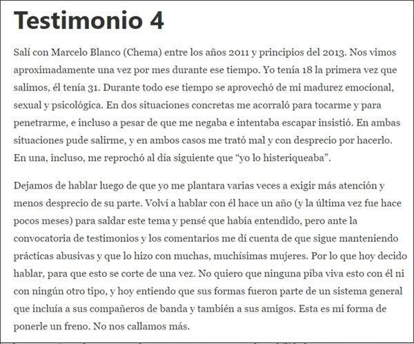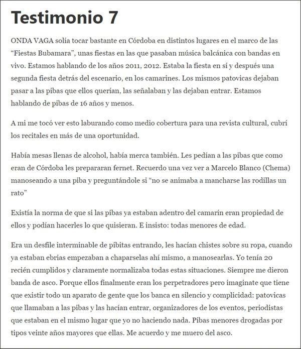 "Mantuvimos vínculos sexuales, noviazgos, encuentros de una sola cita, chats, recitales, camarines pero todos tuvieron un denominador común: el descuido por completo de nuestras subjetividades y cuerpos, aprovechándose de nuestra inmadurez, legitimados por un entorno de colegas cómplices", revelan las mujeres que en ese momento eran menores de edad..