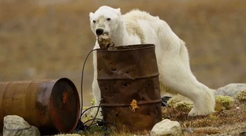 Las imágenes, que fueron filmadas en el último verano boreal del Ártico canadiense, muestran al animal famélico y extremadamente demacrado alimentándose de un tacho de basura.