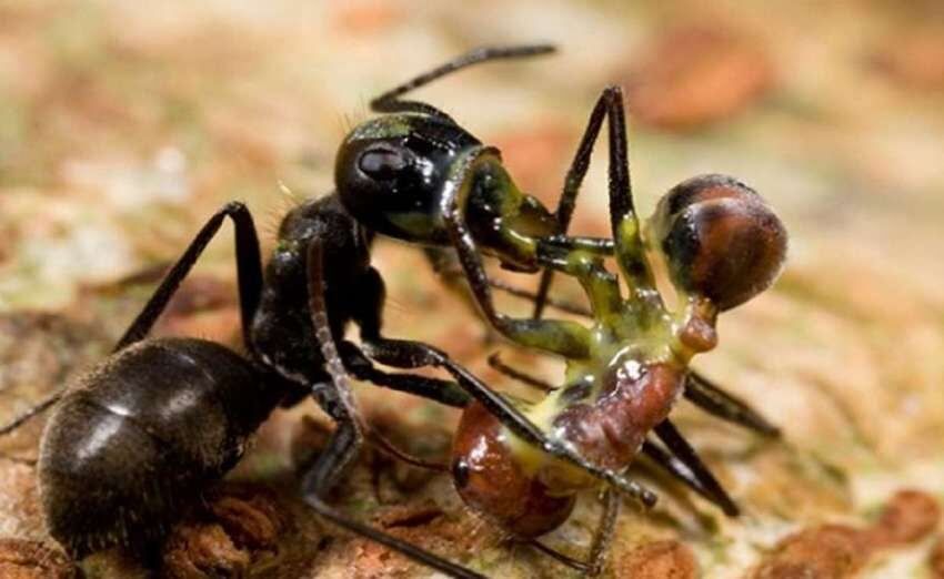 ¿Cómo es el ataque? Las hormigas contraen los músculos de su abdomen hasta romper la pared abdominal, lo que les provoca la muerte inmediata. Sin embargo, al mismo tiempo, los insectos logran vertir un veneno extremadamente pegajoso a sus atacantes, complicando su movilidad.
