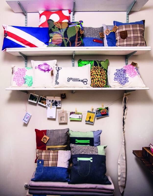 5. En el taller, hay varios motivos de almohadones con telas de distinto tipo. Algunos de ellos, son hechos con telas recicladas de indumentaria antigua o ropa que ya está en desuso. Otros, son con telas de muy buena calidad. Los algodones son comprados en lugares que provienen de cultivos orgánicos, por lo que le dan un plus por su sustentabilidad.