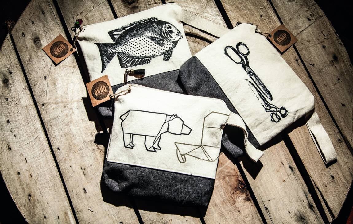 2. Cartucheras con dos tipos de motivos: antiguos dibujos y los actuales trazos facetados o lineales. Estos objetos combinan lino y algodón. La confección de todos los objetos son propios.