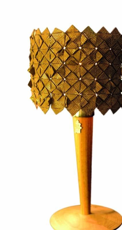 LUMINARIA DE MESA. CON BASE DE MADERA MACIZA TORNEADA Y PANTALLA FORRADA EN PIEZAS MODULARES DE CUERO.