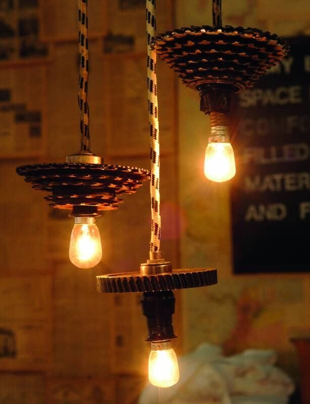 LÁMPARA COLGANTE DE TIPO INDUSTRIAL CON CABLE DE TELA Y ENGRANAJES SOBRE EL PORTALÁMPARAS