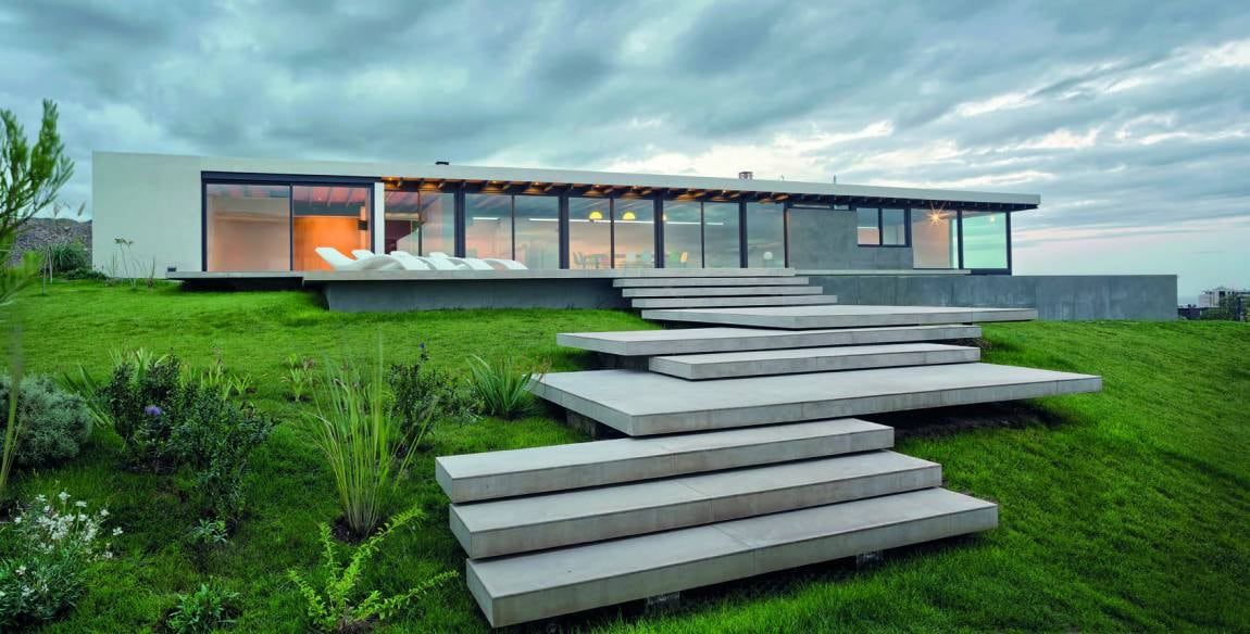 La geografía irregular le ofrece al terreno una pendiente muy pronunciada, que alcanza los 6,5 metros de altura entre la calle norte y la calle sur. Entonces, el proyecto de la vivienda responde coincidentemente al emplazamiento con sus volúmenes distribuidos en forma de C recostada sobre los límites permitidos por el reglamento interno de la urbanización, creándose un jardín central, como reparado de la virginidad del derredor, íntimo y particular, para que hacia él miren todos los ambientes de la casa. Este refugio verde es el punto de convergencia de los aventanamientos, sin perder en ninguna instancia la sensación de pendiente del terreno, valorando el paisaje mucho más allá de ser un mero basamento.