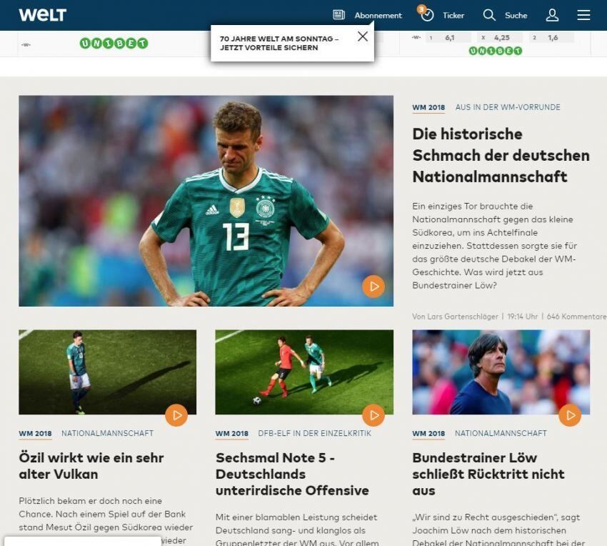 "Voces a la vergüenza alemana de VM: juicio devastador de Löw y Hummels", dice por su parte Merkur. "Los fanáticos del fútbol en toda Alemania están en shock, el equipo de la DFB ha fallado como campeón mundial en la ronda preliminar del Mundial de fútbol 2018. Recopilamos las reacciones".