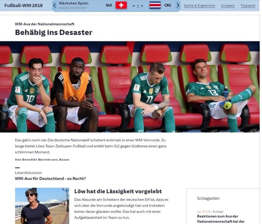 El diario Welt tituló "La desgracia histórica del equipo nacional alemán". "El único objetivo requerido -dice el medio alemán- era que el equipo nacional se enfrentara a la pequeña Corea del Sur para pasar a la segunda ronda. En cambio, causó la mayor debacle alemana en la historia de la Copa del Mundo. ¿Qué será del entrenador Loew?".