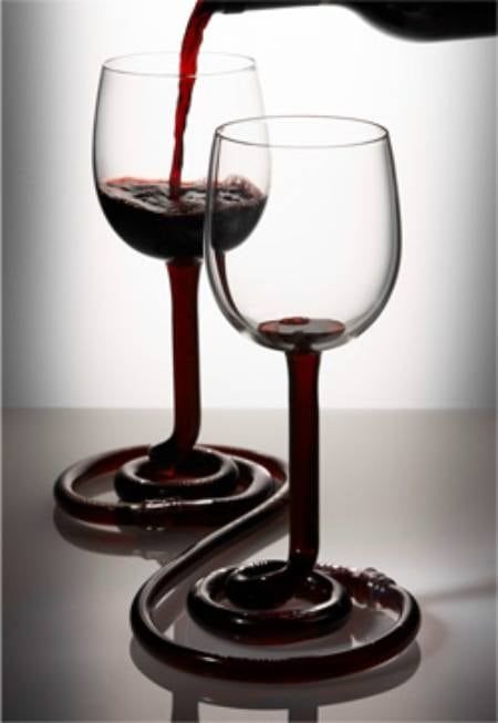 Unidas por un vástago, estas copas se unen entre sí. Para tomar de a dos el vino o en caso que se complique, coordinar muy bien el movimiento.