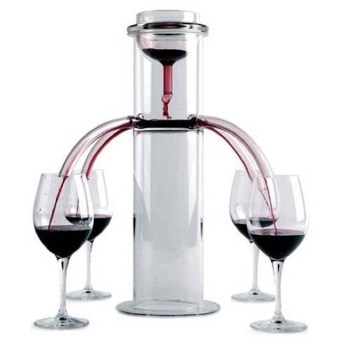 Los responsables de esta creación son Acquacalda Design que, basándose en la física aplicada, han dado solución a un problema de reparto, ya que con este aparato todos recibirán la misma cantidad de vino en sus copas.