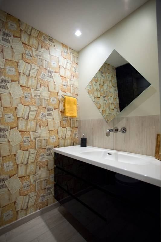 Si te gusta salirte de la norma, tu cuarto de baño se saltará algunos convencionalismo clásicos, como la de que el espejo debe estar colocado en horizontal. El espejo forma un rombo y le da un aire canalla a un cuarto de baño donde el mobiliario en negro le aporta un aire misterioso. Por otro lado, el revestimiento de papel pintado está repleto de libros, así que no faltarán lecturas en el cuarto de baño.