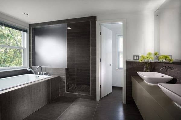 Con aires minimalistas, acabados lacados y una paleta de colores que juega con los grises y los blancos, con algunos toques de crema y la presencia del negro en algunos detalles, este amplio y moderno baño invita a un descanso y un relax de lujo.
