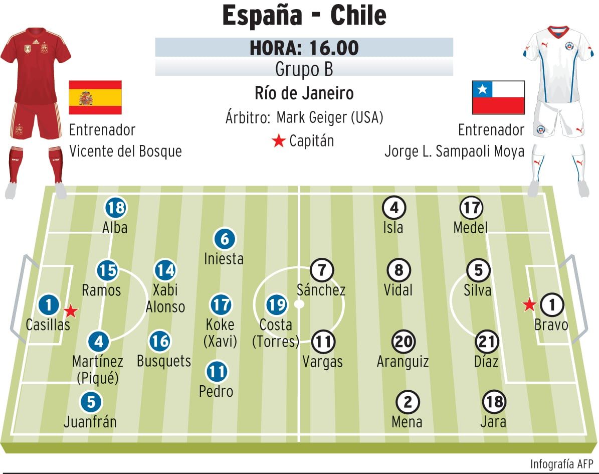 Para Chile, segundo del Grupo B con tres unidades, un triunfo sería casi definitivo. Probablemente le daría el pase a los octavos de final y mandaría a los españoles a casa. “Ningún momento es bueno para jugar con España”, aseguró el técnico Jorge Sampaoli. “Más allá de lo futbolístico, uno sabe muy bien que va enfrentar a una España necesitada y la transcendencia de la eliminación del ultimo campeón del mundo sería histórico para nosotros”.