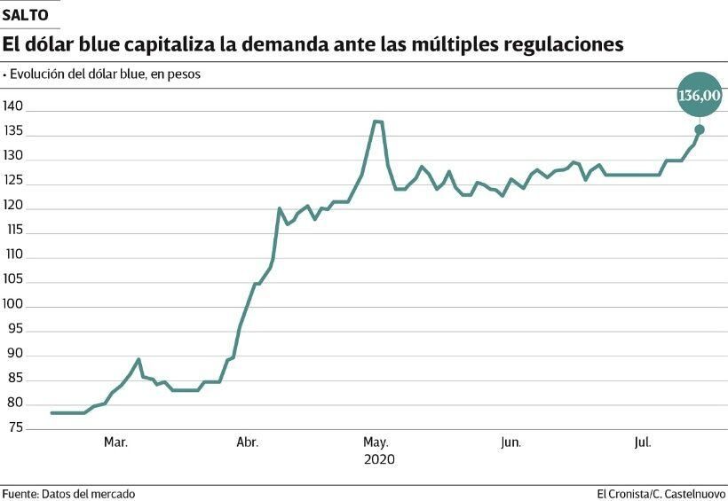 La cotización paralela de la divisa trepó ayer $ 3 y alcanzó los $ 136. De esta manera, volvió a acercarse a los máximos alcanzados a mediados de mayo, cuando tocó los $ 138. Y amplió la brecha con el dólar oficial a 80%.