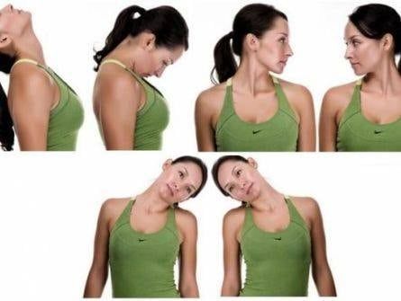 1) Sentate con la espalda recta y los brazos a los lados del cuerpo bien extendidos. Estirá el cuello hacia adelante tanto como puedas y gira el cuello con cuidado hacia uno de los lados, tratando de mantener la posición unos cuantos segundos. Luego regresá a la posición inicial para hacer el ejercicio hacia el lado contrario. Podés hacer 5 a 10 repeticiones.