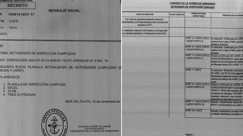 Ese mismo día, el submarino cambió de rumbo para ir a Mar del Plata por el ingreso de agua. El capitán de navío Claudio Villamide firmó un "mensaje naval secreto", en el que reconoció que había pospuesto para diciembre la inspección de seguridad que debía realizarse al ARA San Juan. Es que en julio del año pasado, el submarino tuvo también problemas con el snorkel y las baterías.