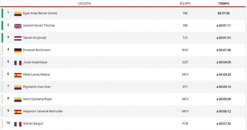 En el tercer lugar se ubicó el holandés Steven Kruijswijk con 82h, 58m y 31s, cliclista integrante del team Jumbo-Visma.