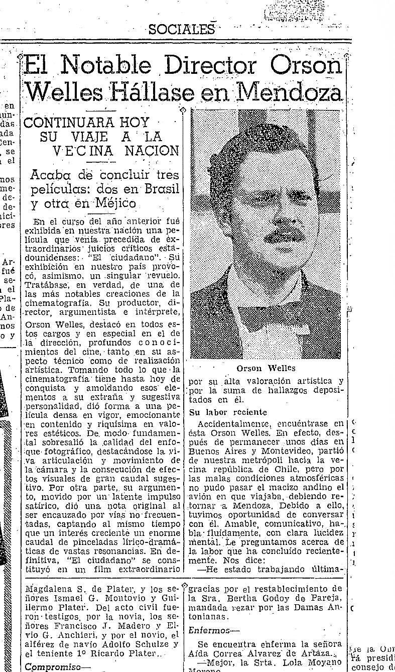 Accidentalmente, encuéntrase en ésta Orson Welles. En efecto, después de permanecer unos días en Buenos Aires y Montevideo, partió de nuestra metrópoli hacia la vecina república de Chile, pero por las malas condiciones atmosféricas no pudo pasar el macizo andino el avión en que viajaba, debiendo retornar a Mendoza.