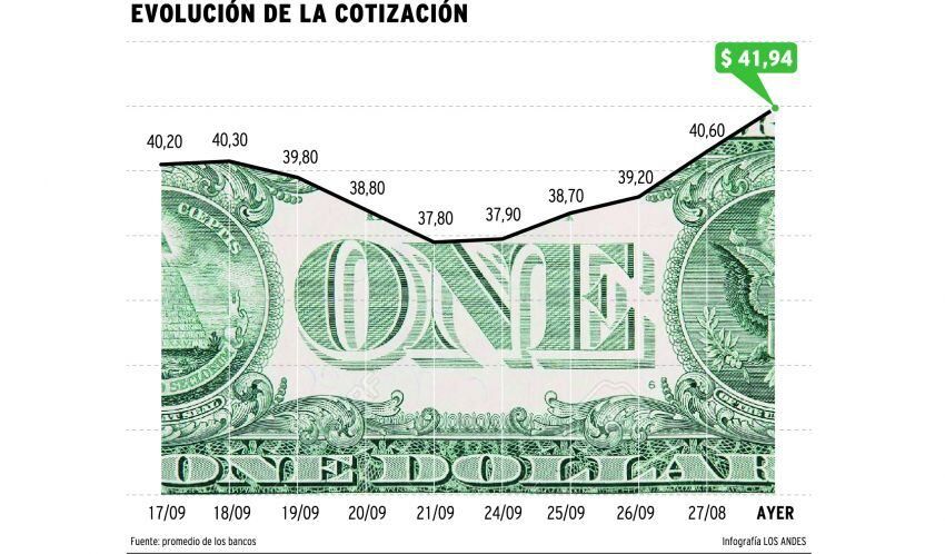 El dólar subió ayer hasta el récord de 41,91 pesos por unidad y se acercó un poco más al techo de 44 pesos que el Gobierno impondrá para octubre a partir del lunes cuando ponga en marcha la nueva política cambiaria.