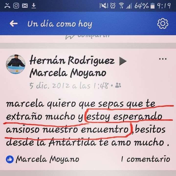 Durante la mañana de hoy, la mujer compartió un recuerdo en su perfil: un mensaje que Hernán le dejó también en su Facebook el 5 de diciembre de 2012, mientras él se encontraba en la Antártida.
