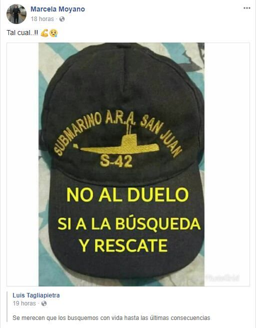 Más allá de esta noticia, lejos parece estar Marcela de la resignación. Ayer compartió una foto de una gorra de la tripulación del ARA San Juan con la leyenda: "No al duelo. Sí a la búsqueda y al rescate".