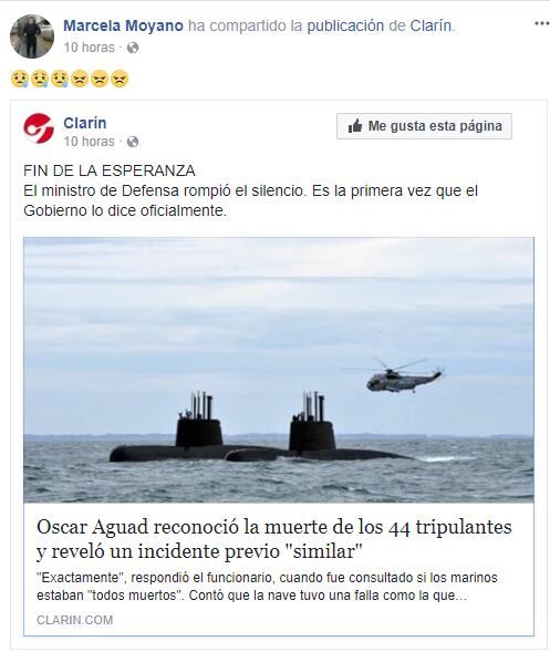 La mujer también utiliza su cuenta para compartir las últimas noticias sobre la búsqueda del ARA San Juan y -de hecho- compartió recientemente la nota referida a que el ministro de Defensa, Oscar Aguad reconoció la muerte de los 44 tripulantes.