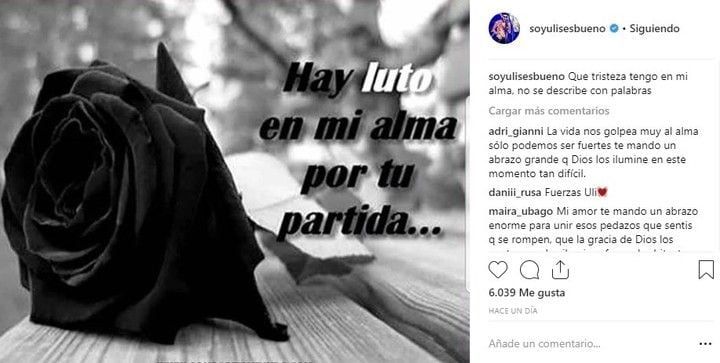 En tanto, su primo (y hermano del cuartetero) Ulises Bueno habló en Instagram sobre su dolor: "Qué tristeza tengo en mi alma, no se describe con palabras", escribió junto a una imagen de una rosa negra que a su lado tenía inscripto: "Hay luto en mi alma por tu partida".
