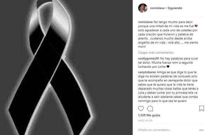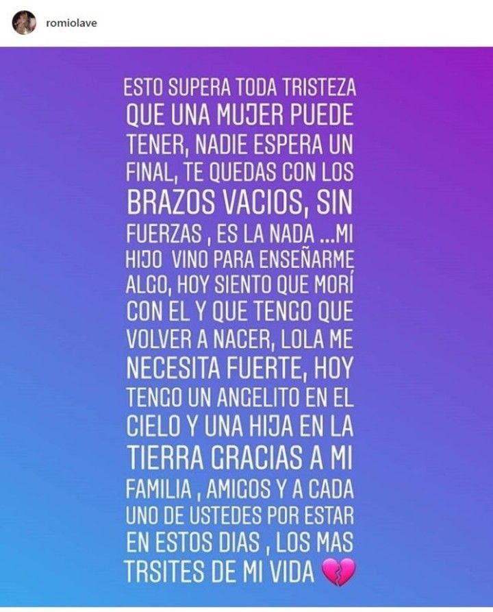 "Esto supera toda tristeza que una mujer puede tener. Nadie espera un final. Te quedás con los brazos vacíos, sin fuerzas, es la nada... Mi hijo vino para enseñarme algo. Hoy siento que morí con él y que tengo que volver a nacer". Lola me necesita fuerte. Hoy tengo un angelito en el cielo y una hija en la Tierra".
